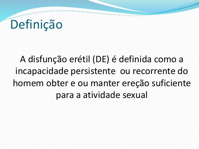 Dois em cada três homens com diabetes podem tolerar de disfunção erétil. A disfunção erétil é um impecilho de saúde de subida predomínio entre os homens com mas de 40 anos, e cobija um importante impacto na qualidade para toda a vida do varão afetado, como a de seu companheiro.